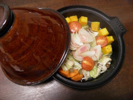 すき焼鍋に陶器のタジン蓋をのせて